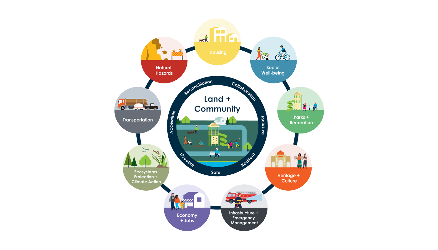 While land use plans and policies are central to an official community plan, the document also outlines the community’s broader objectives across a range of policy areas. An official community plan integrates land use planning with objectives related to social, cultural, economic, and environmental sustainability. It establishes a strategic framework to guide growth and development while protecting and enhancing community livability.